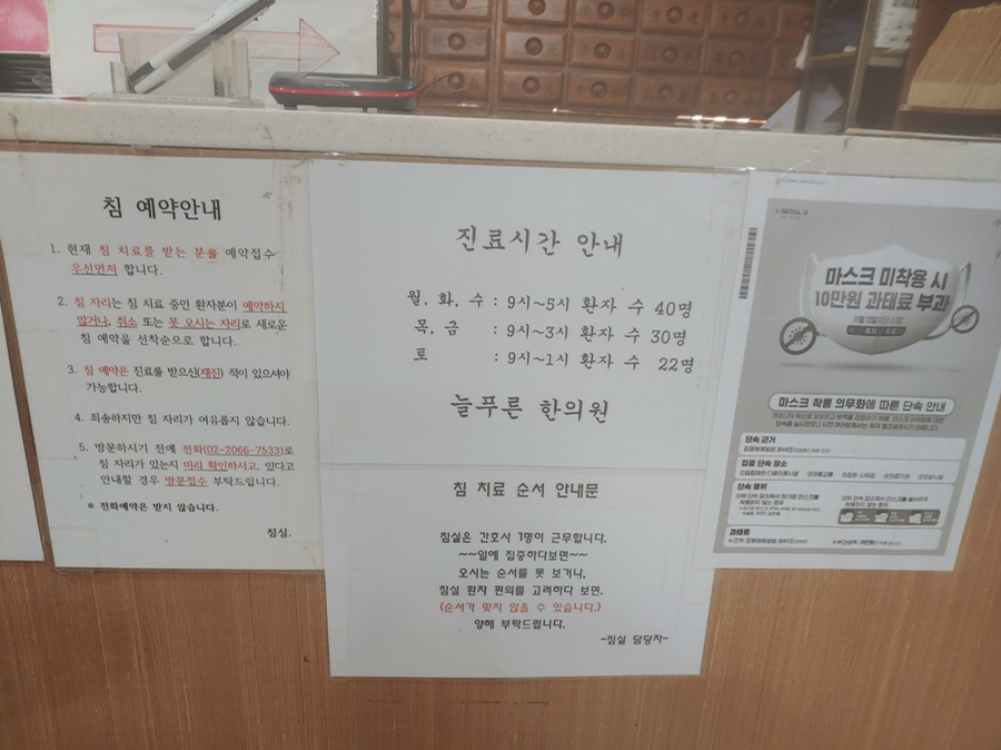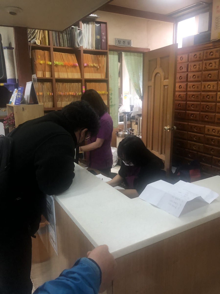 9시에 한의원 문이 열리면 들어가서 오늘 언제 올것인지 인원과 시간을 예약하고 예약한 시간에 다시 오면 됩니다. 제가 예약한 날은 30명까지 예약을 할 수 있는 날이였는데 만약 본인 앞에 30명이 이미 있다면 그냥 돌아가야합니다. 제 뒤로 3분정도가 컷 당했었는데 아무리 멀리서 오랫동안 기다려도 딱 그날 정해진 인원만 진료를 하는 것 같았습니다.